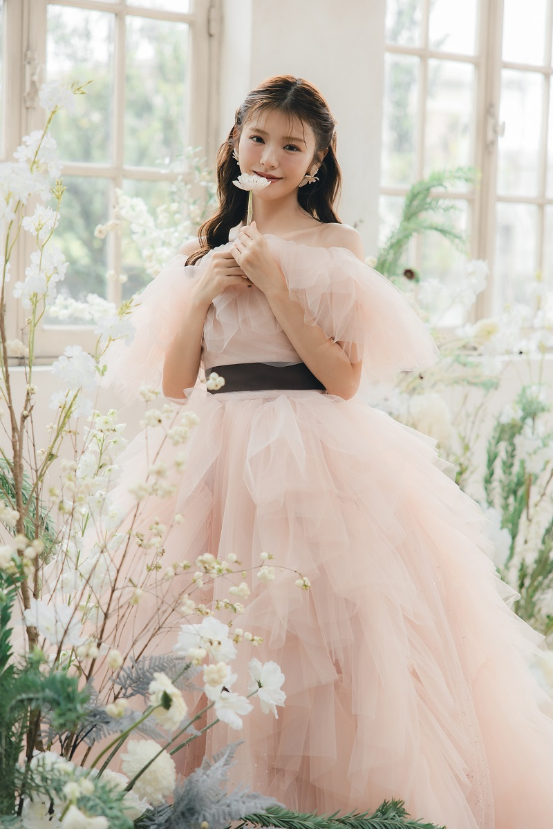 たっぷりのチュールフリルの間からグリッターが輝くボリュームのあるドレス。