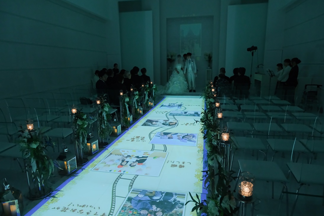 挙式ではお父さんへ向けたアイルランナーのマッピング映像と