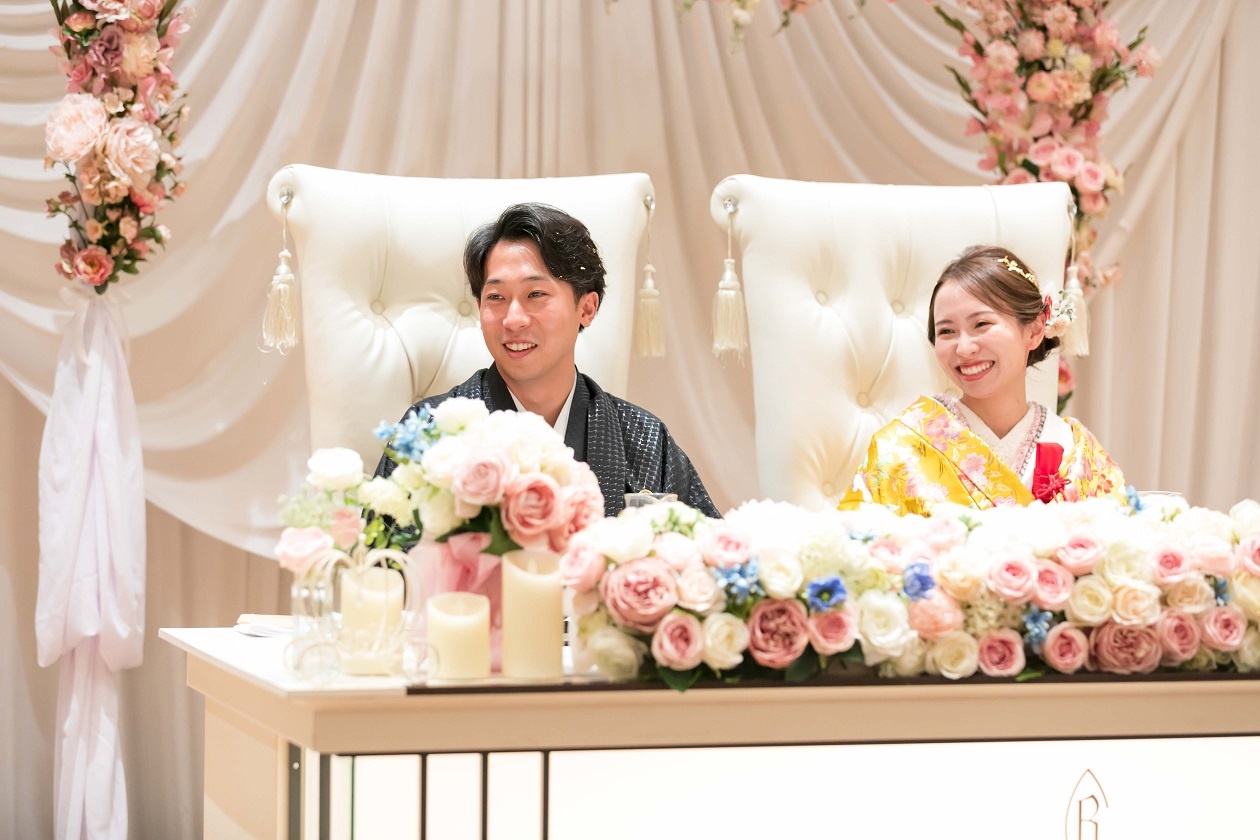 メインテーブルの装飾も相まって衣裳が華やかに見えますね!