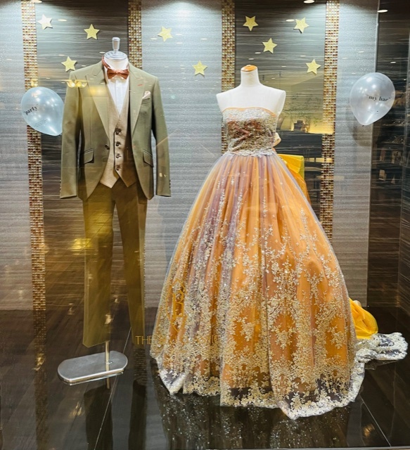 タキシードはカーキとゴールドとブラウンの組み合わせ、ドレスはテラコッタのお色味♪