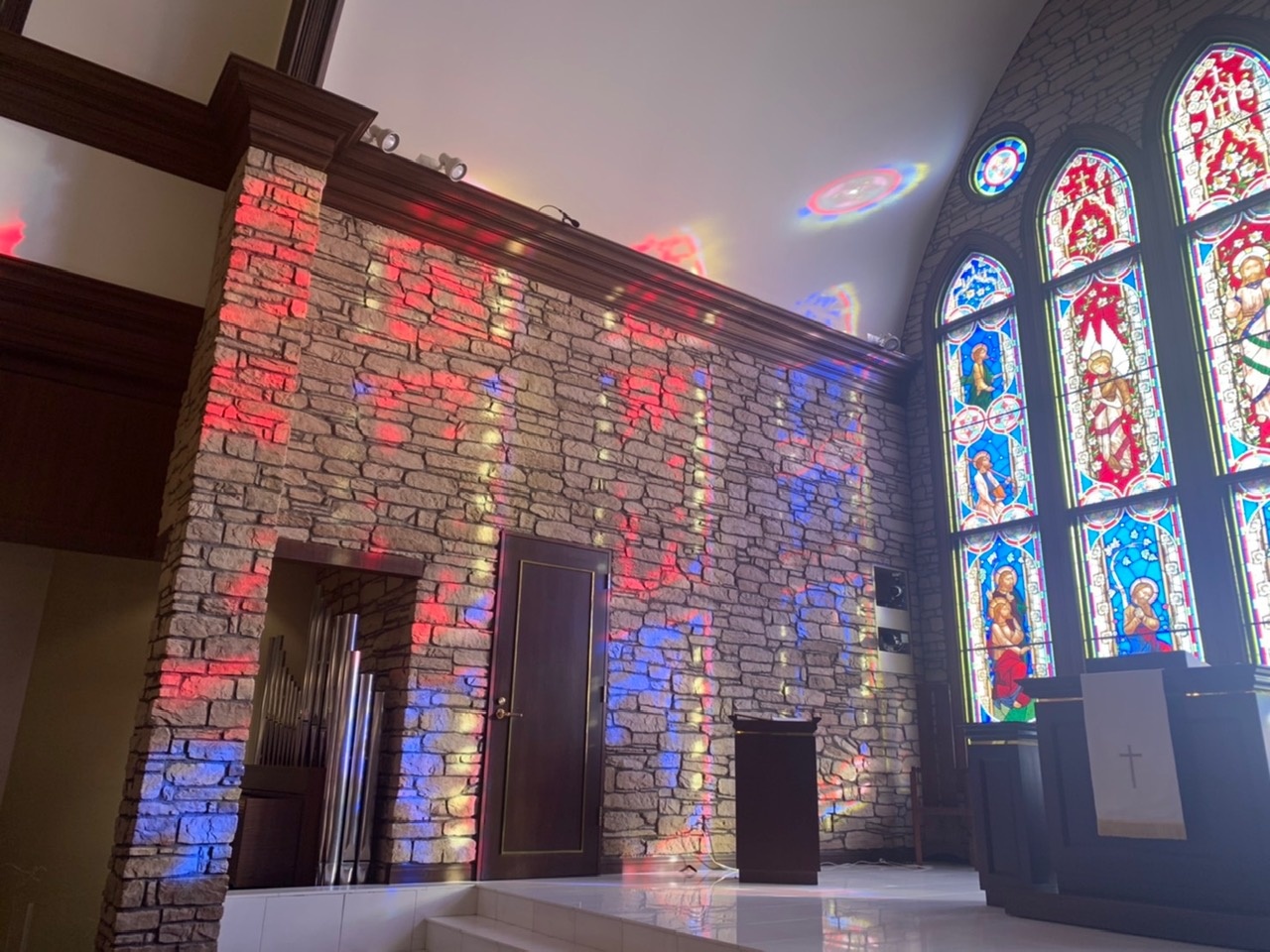 ステンドグラス越しに差し込んだ光が壁にも反射し、とても神々しい雰囲気