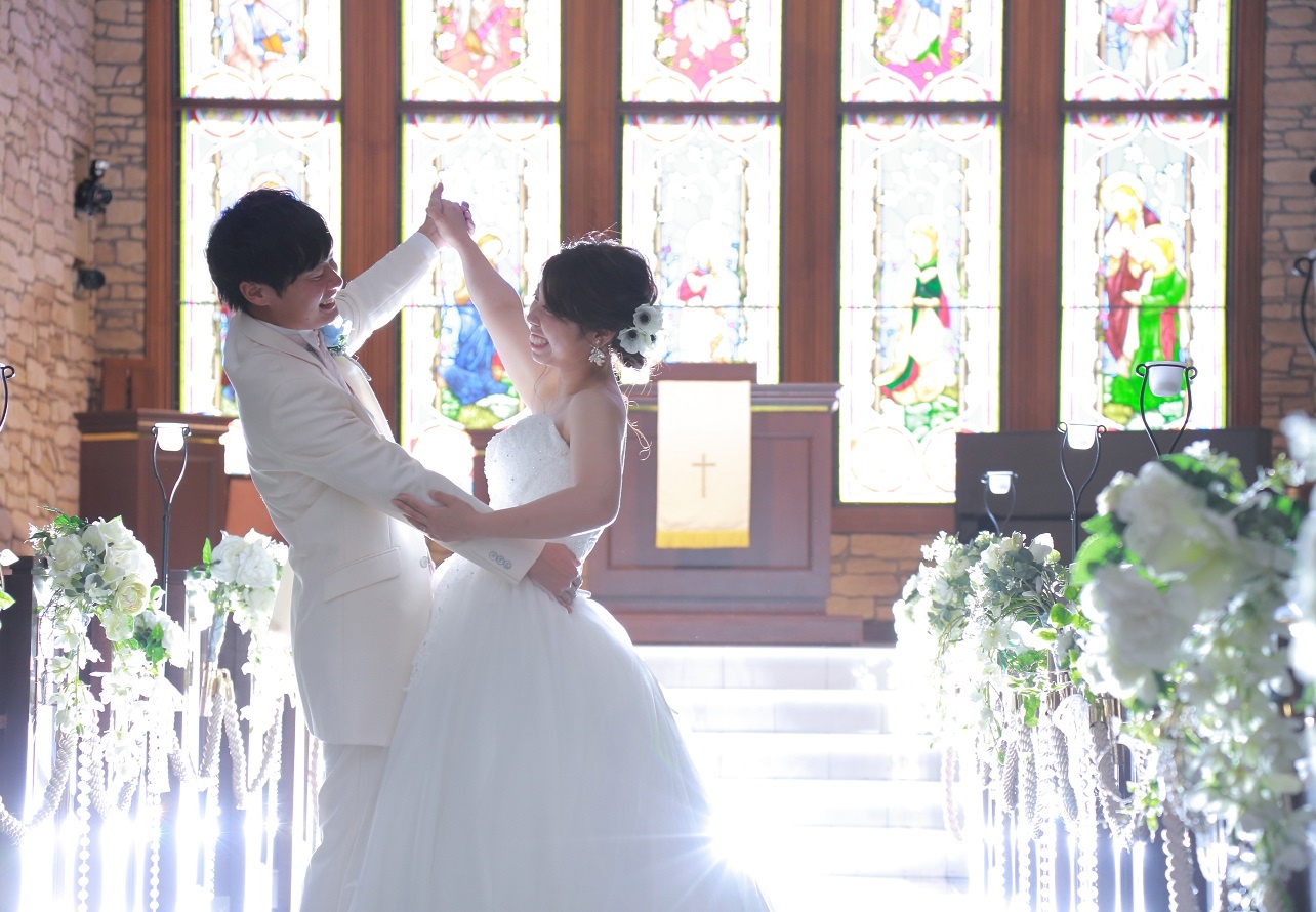 ステンドグラスから差し込む光、広々としたバージンロード。
