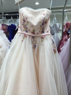 淡いピンク色に、カラフルなお花の刺繍が入っていて、春っぽく可愛らしいドレスになっています。