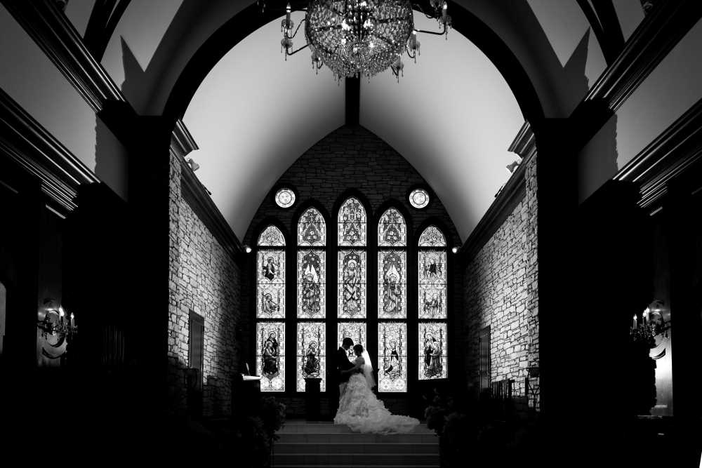 お写真に残す際はステンドグラスにつつまれているおふたりを残すことができます。