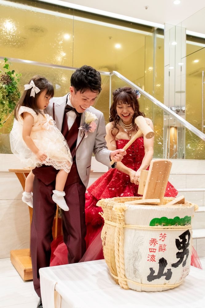 新郎新婦様に酒樽を木槌で開けて頂く鏡開き