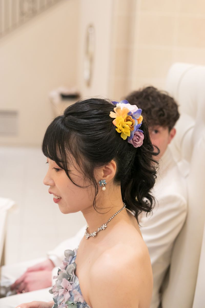 花柄のドレスに合わせてヘアスタイルにもお花を…❁