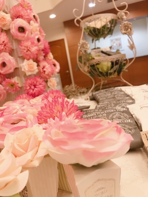 過去に行ったブライダルフェアの時にプチギフトをテーブルに可愛く装飾した時のお花のついた飴とスナックの写真です( *´艸`)