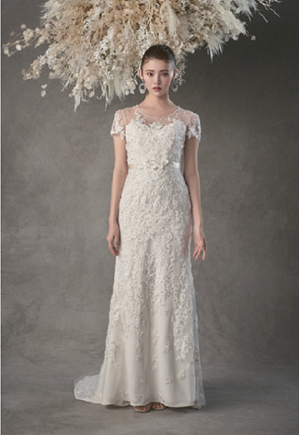可憐ながらも 一つ一つ輪郭と存在感を称える花の刺繍をドレス全体にあしらい