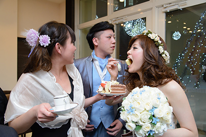続いてファーストバイトではお2人共大きなフォークで食べさせあいをしました