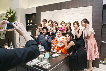 祝宴がスタートするとお2人の周りにゲストが押し寄せ記念写真