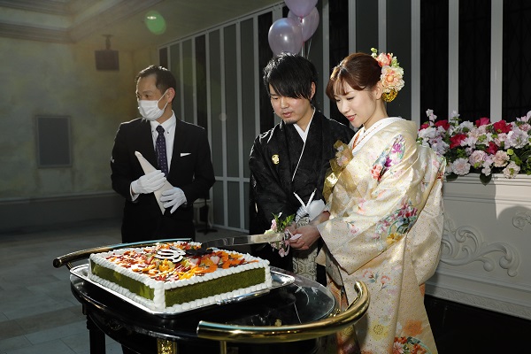 和装での演出の一つとして和風なウェディングケーキ入刀が人気!