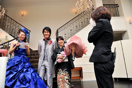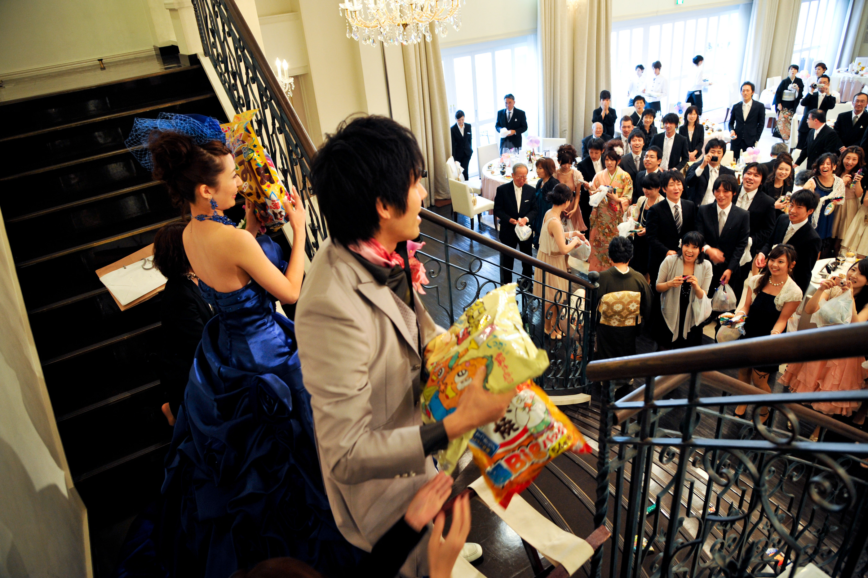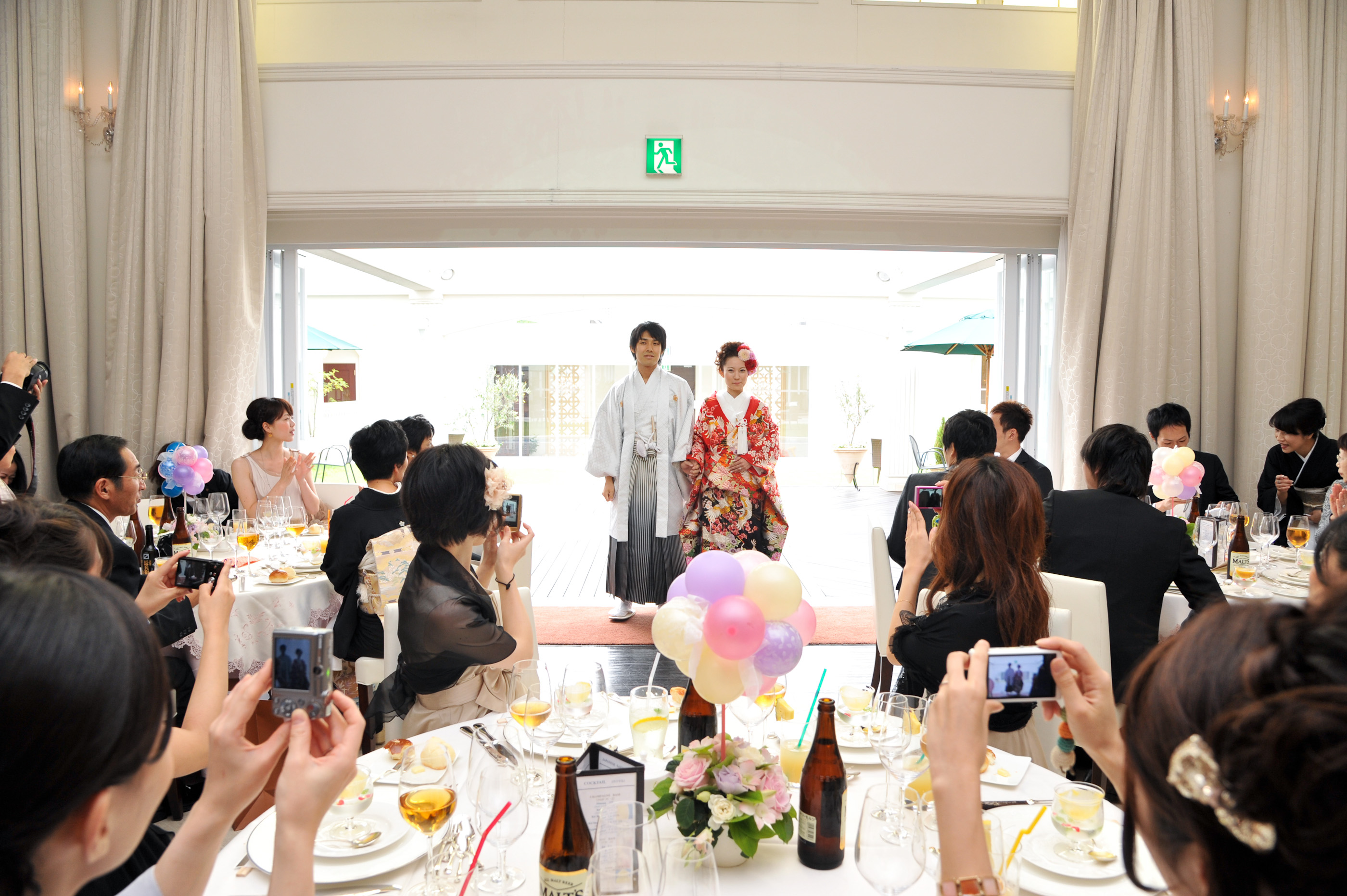 お庭で乾杯、ケーキ入刀やファーストバイトをし