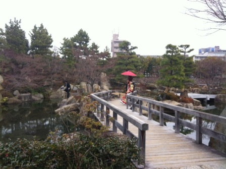 和装を着て、徳川園に