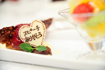 スピーチや受付のご友人にはデザートメッセージで感謝を伝えました。