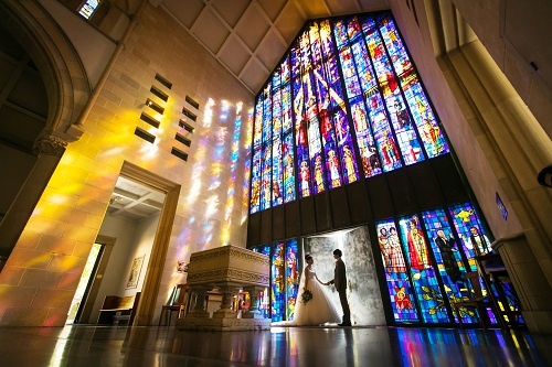 ステンドガラスが映える神聖な場所にてとりおこなえる挙式は