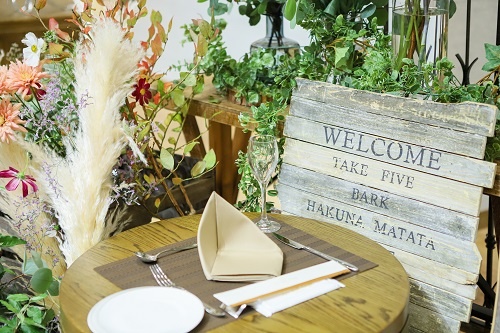 高砂ソファーの横にはおしゃれなウェルカムボードと