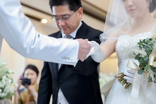 お父様の手から新郎様の手へ幸せの”バトンタッチ”
