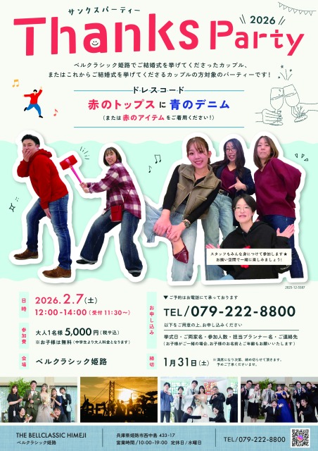 - ベルクラシック姫路でご結婚式を挙げて下さったカップル、または これからご結婚式を挙げて下さる全ての方を対象としたサンクスパーティを開催します!!!