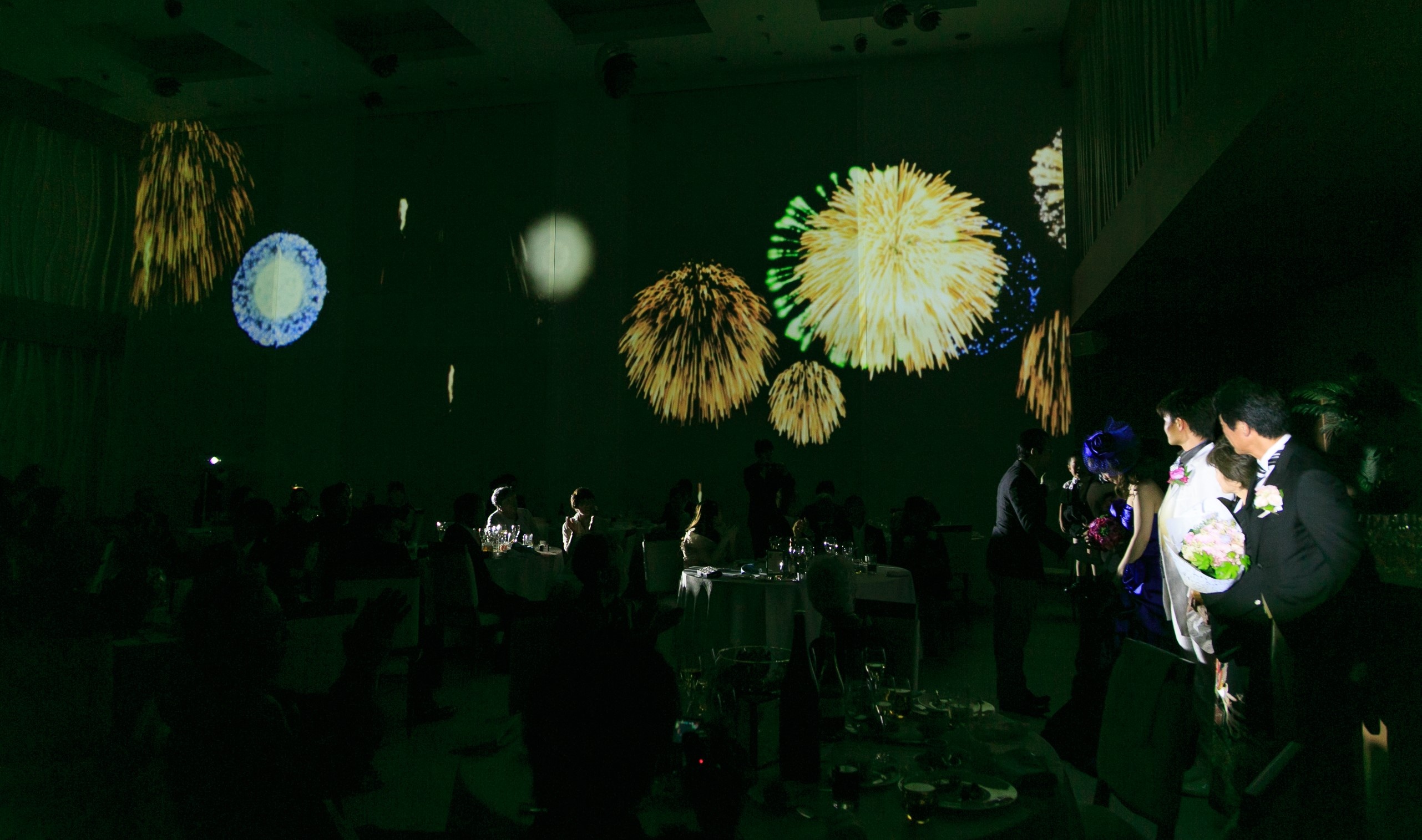 新郎新婦様の退場の際は、やはりプロジェクターマッピングの花火を
