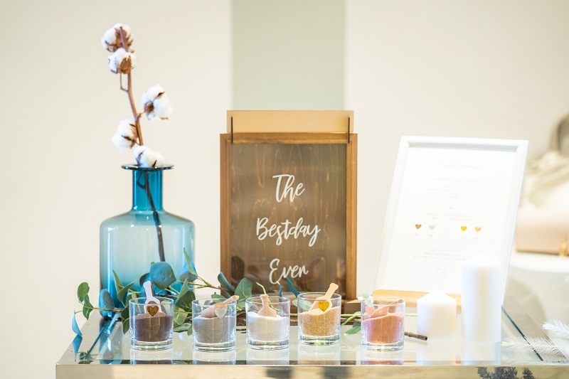一度入れた細かい砂は二度と元の色の砂に戻せないことから、 サンドセレモニーには「ふたりが永遠にひとつの家族として生きていく」という意味が込められています。