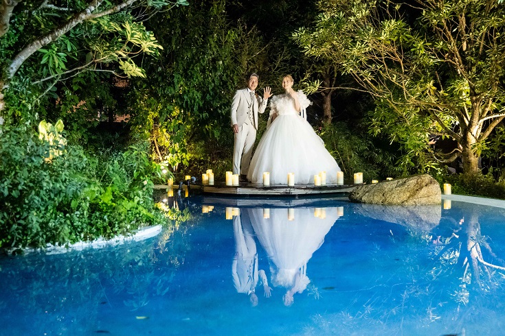 御披露宴中に水上のバルコニーにご登場された新郎新婦様( *´艸`)