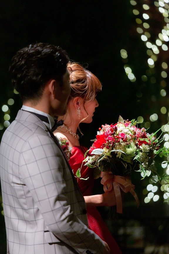 お二人の背景に煌めくイルミネーション。