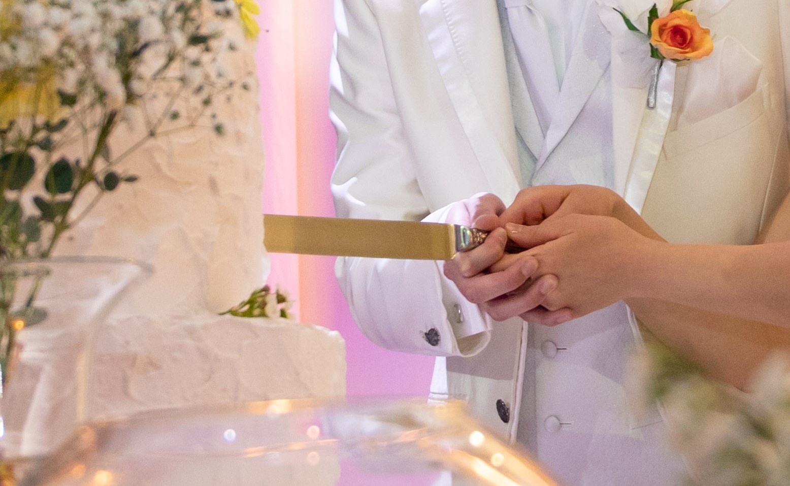 ケーキカット後に新郎新婦のファーストバイトを行った後