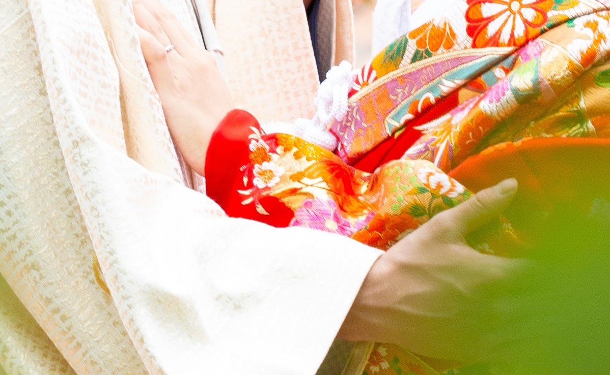 新郎の白の羽織袴、新婦の赤の色打掛が