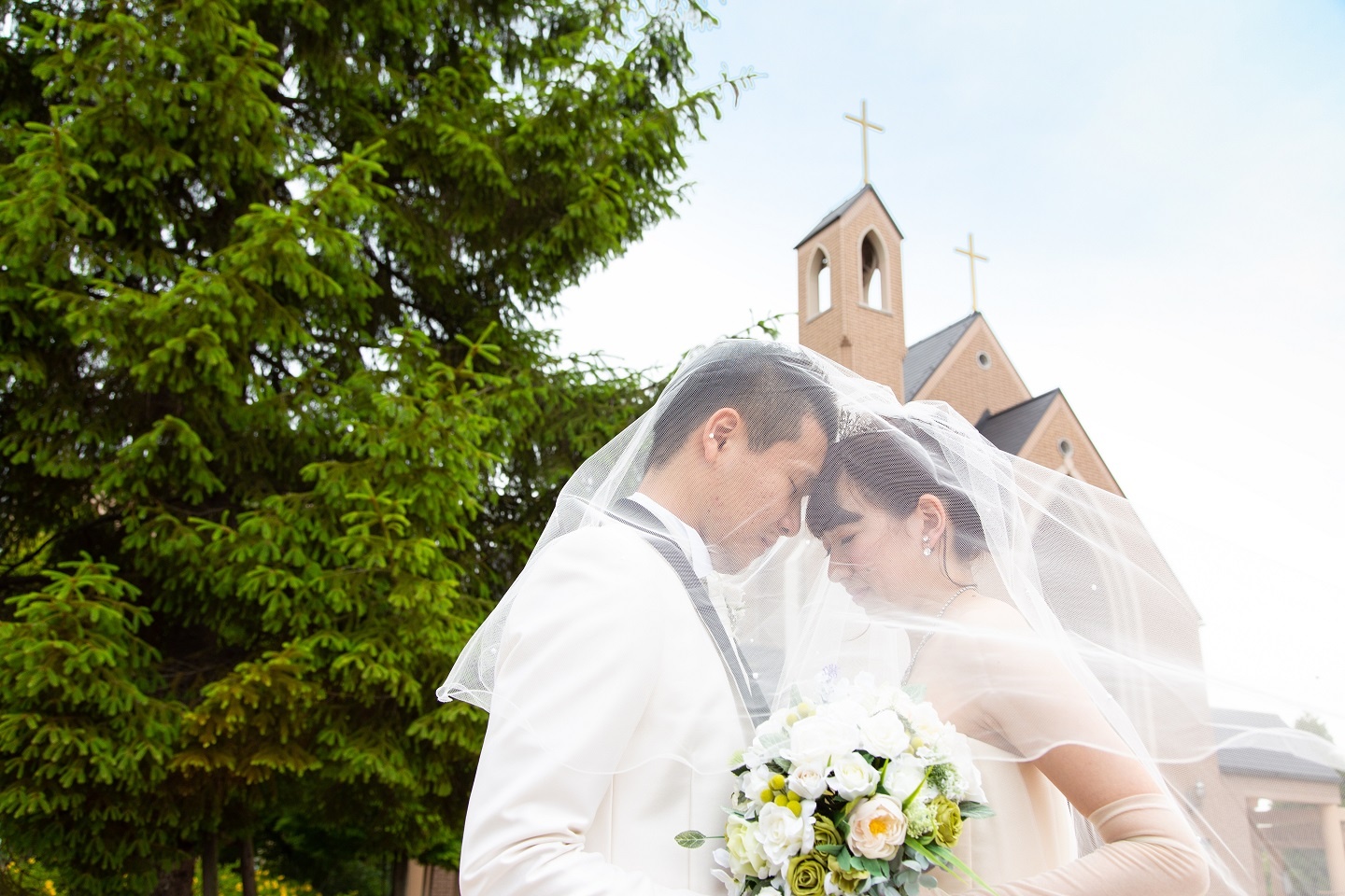 教会の扉を開け、ベールが風に舞う様子を再現した
