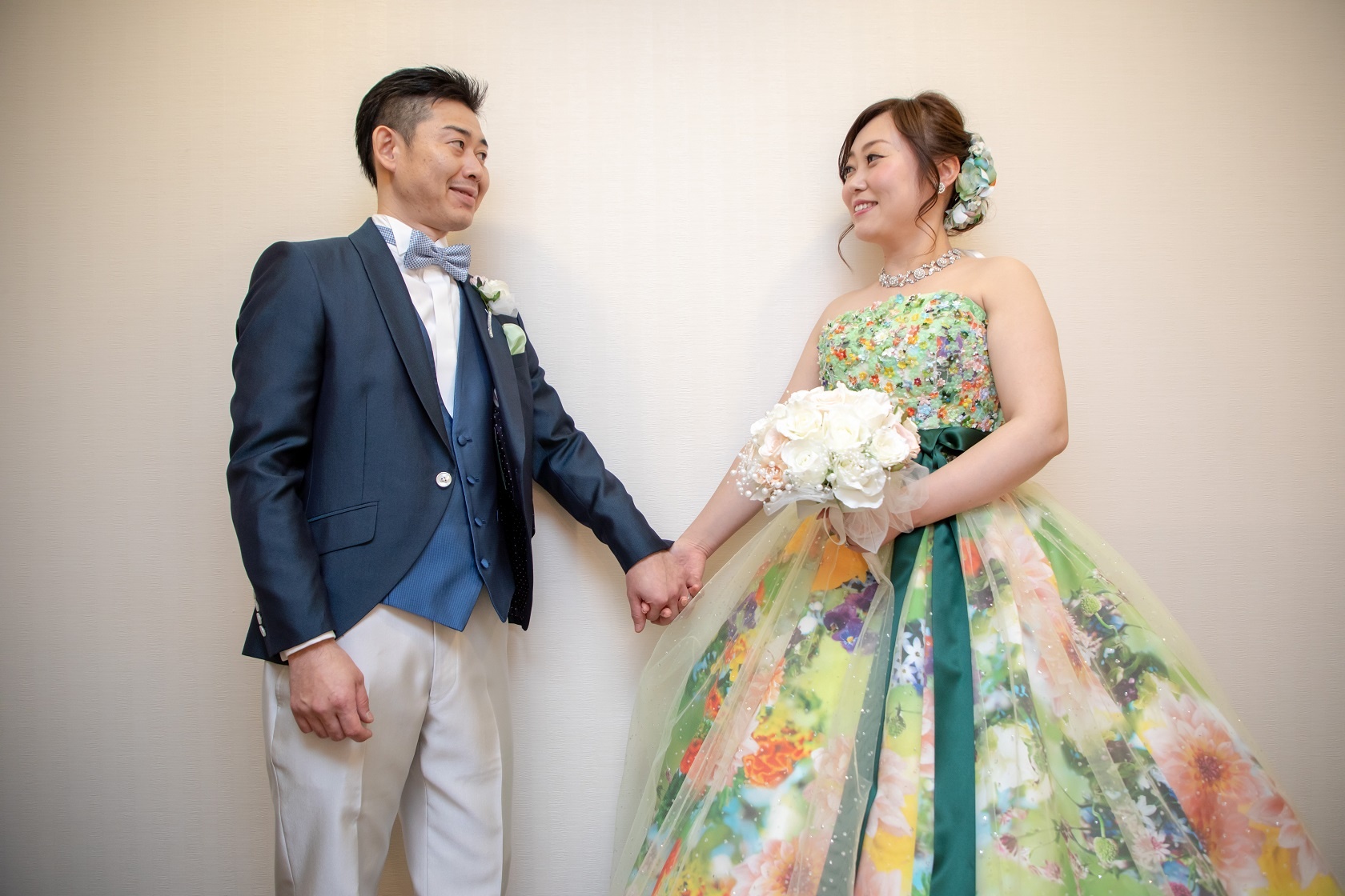 式場で取り扱いしております 蜷川実花のカラードレスです! こちらはドレス全体にお花がプリントされておりますが 優しいグリーンのお色目をベースに