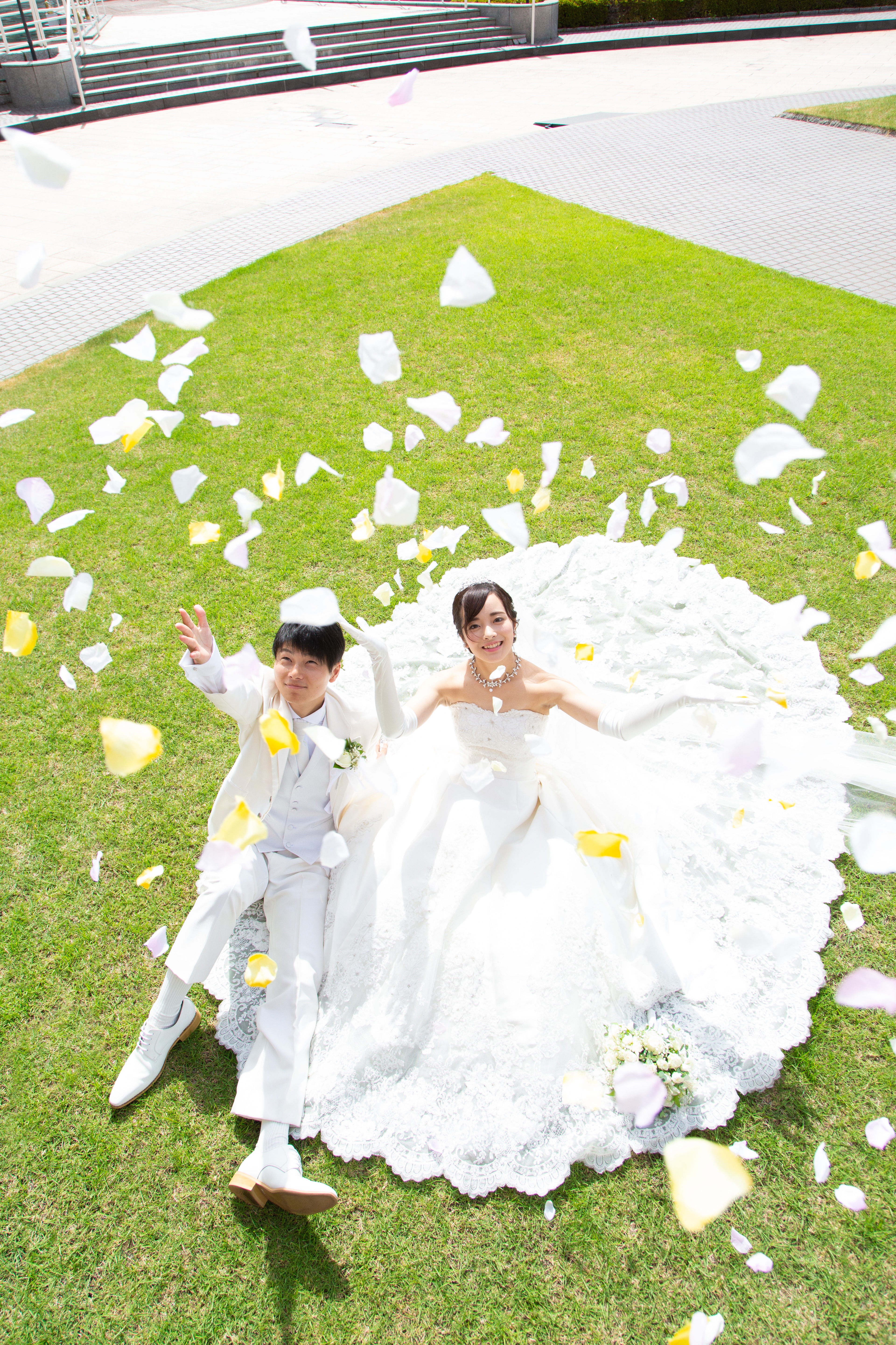 お二人がフラワーシャワーの中にいるようなこちらのお写真