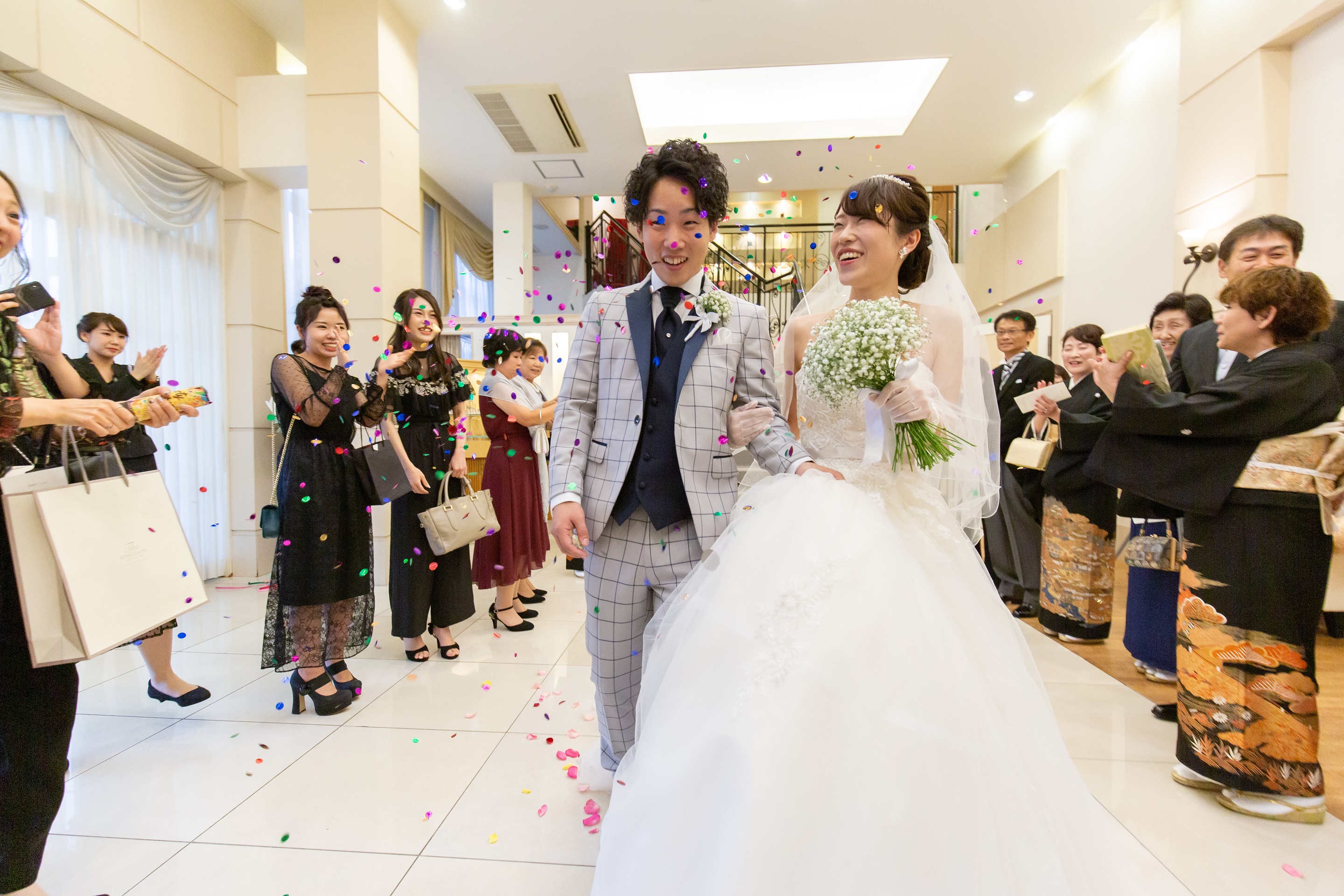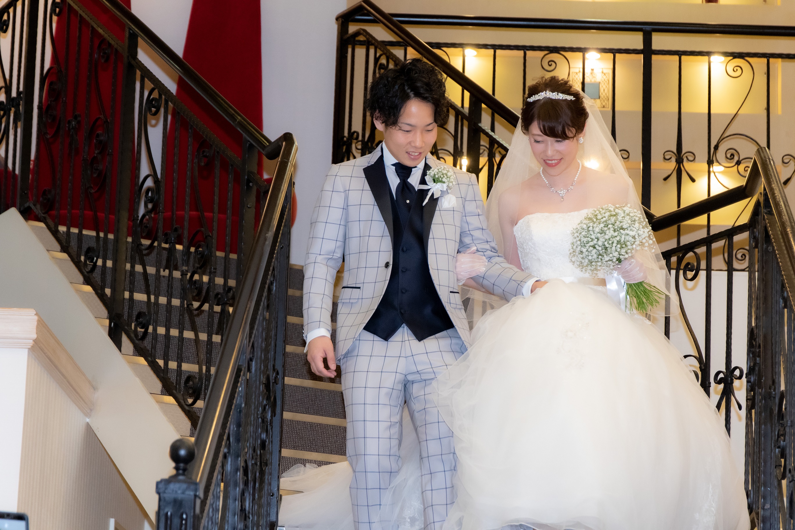 階段があるロビーで新郎新婦が降りて来られます