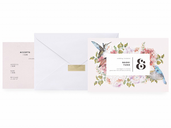 お庭に咲き誇る花の周りを羽ばたく二羽の鳥はまるで新郎新婦様のようなデザイン