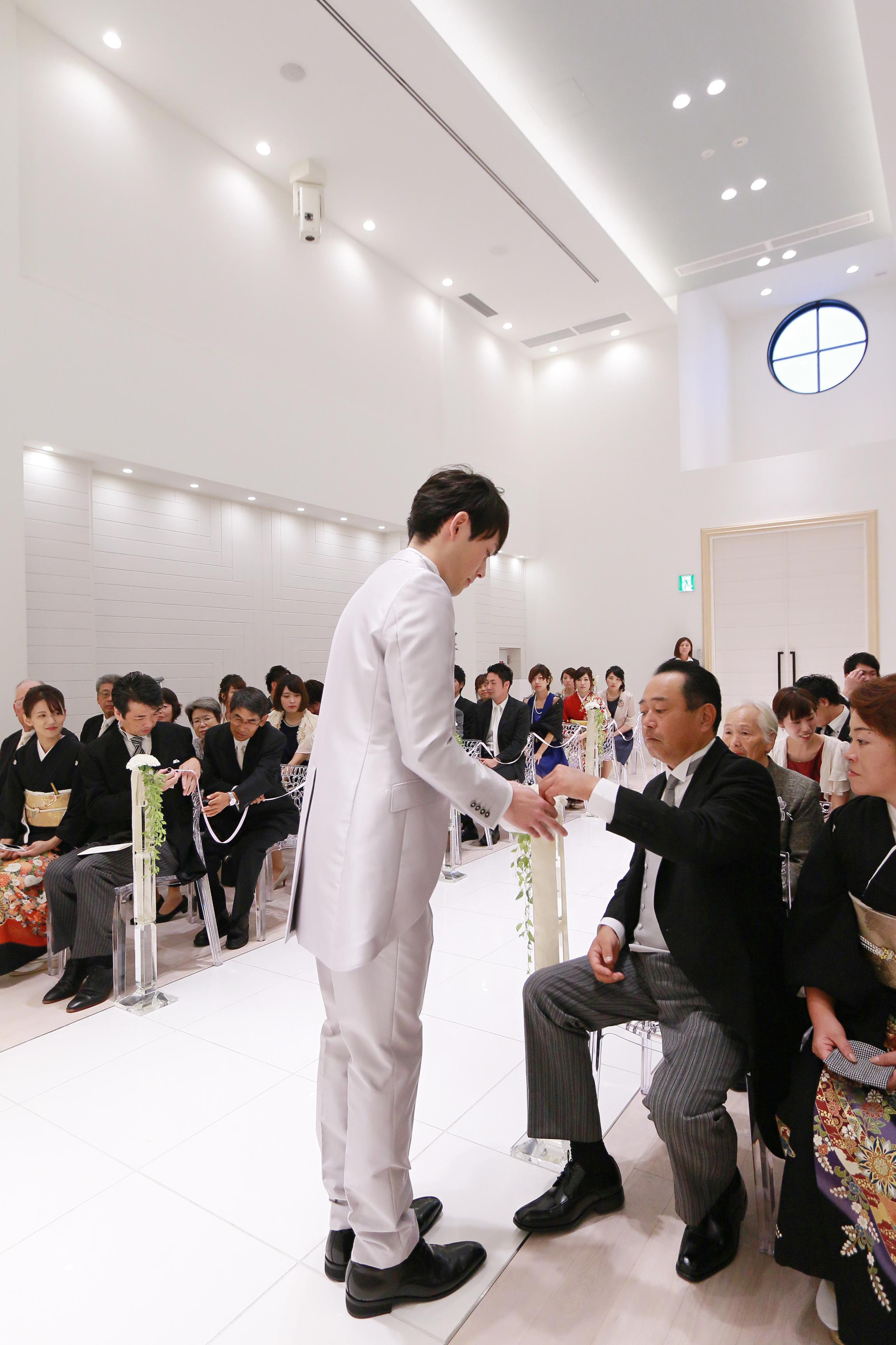 新郎新婦のご両親のところまで運ばれた指輪をリングピローへ・・