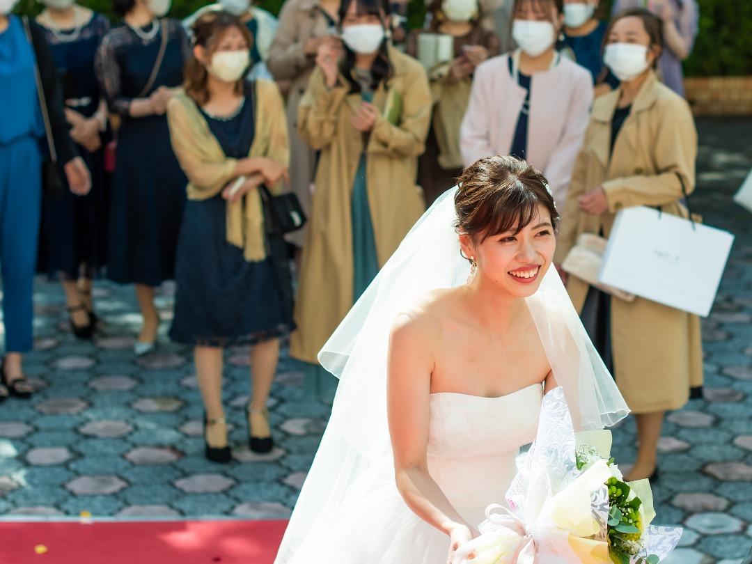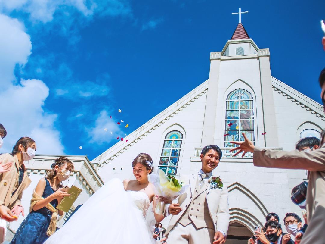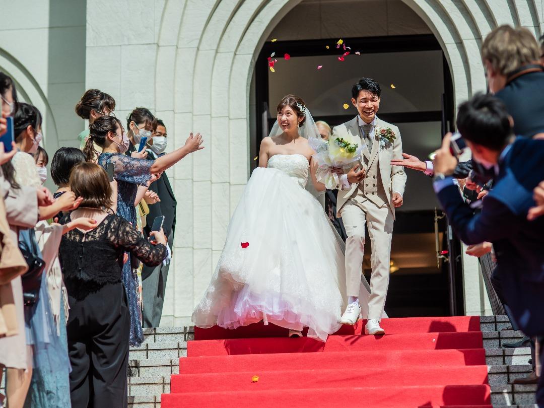 挙式後にはゲストの方々がフラワーシャワーでお2人を祝福♡