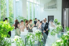 チャペルは自然光が差し込み、周囲は緑、ガラス張りのバージンロード、水の流れる音、、、