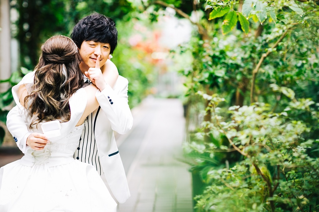 新郎様が新婦様の後ろに指輪やメッセージを隠して