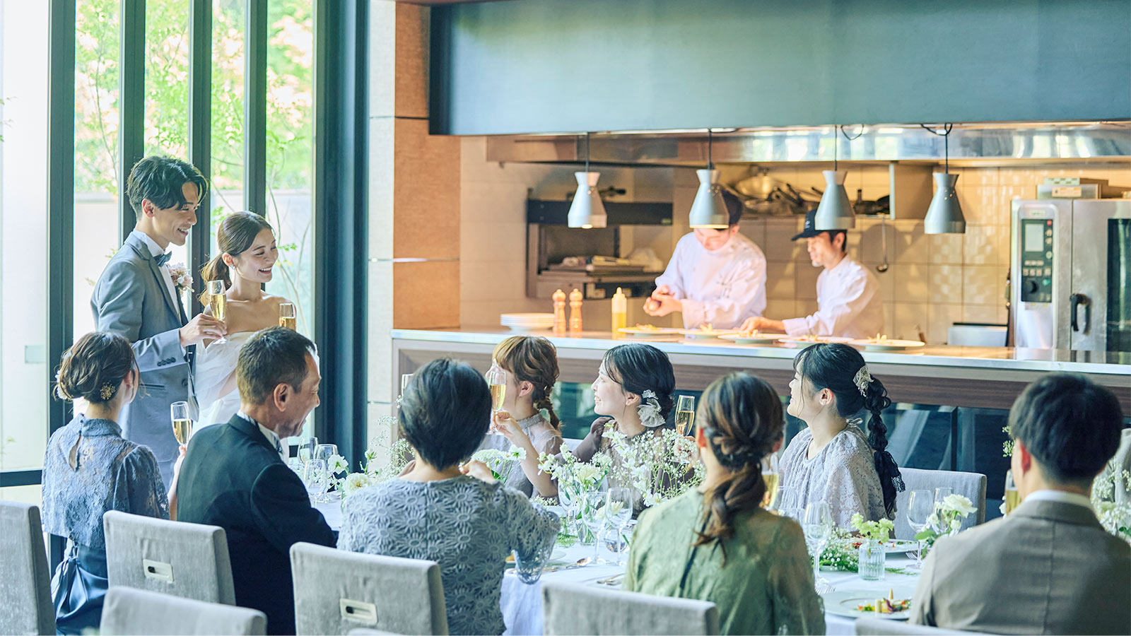 オープンキッチンから届く出来立てのお料理と落ち着いた空間で、会話と美食を楽しむ上質なパーティが叶います。二次会や少人数婚にも最適です。