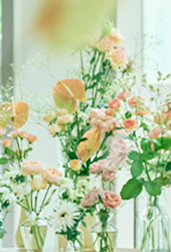 会場に一歩足を踏み入れた瞬間の空気感やときめき。 私たちは、言葉にしきれない“おふたりらしさ”や“世界観”を、花で表現しています。 好きな色や好きな季節、大切な思い出。 お話の中にある小さなヒントを大切にしながら、空間全体をデザインしていきます。 写真に残る美しさだけでなく、その場に流れる空気まで心地よく。 おふたりの一日がより記憶に残る景色になるよう、心を込めてお手伝いいたします。
